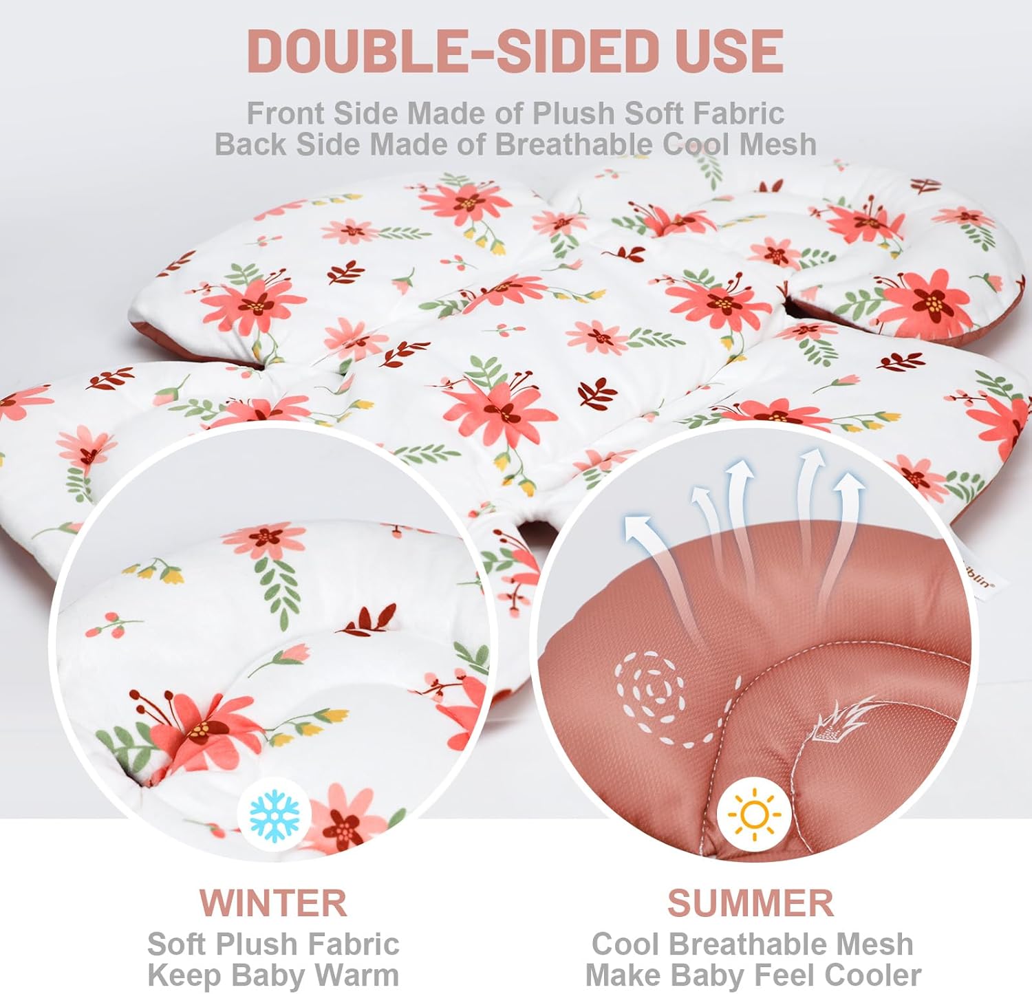 - Revesible for All Seasons: One side of the newborn car seat insert is made of soft plush velvet fabric keep babies warmer in winter, and the back side is made of cool breathable mesh that makes babies feel cooler in summer, both sides printed with different adorable patterns ,make your little one comfortable in no matter summer or winter