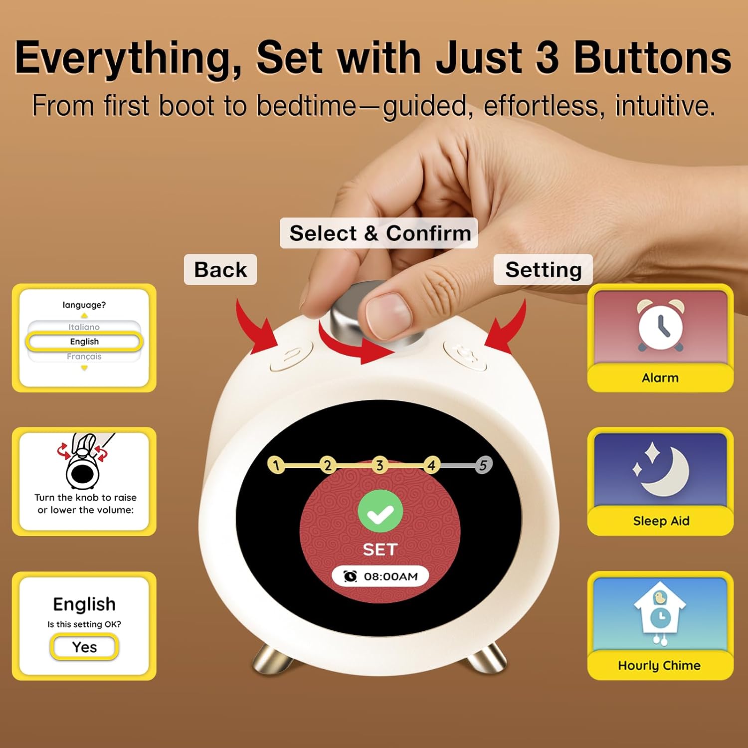 - ăArtistic Smart Display Hourly Chime Clockă â 2.8" IPS full-color screen with auto-dimming adapts to room lighting, displaying vivid clock themes (Ninja/Spaceman/Knight...) and calming sleep animations for visual delight day and night.