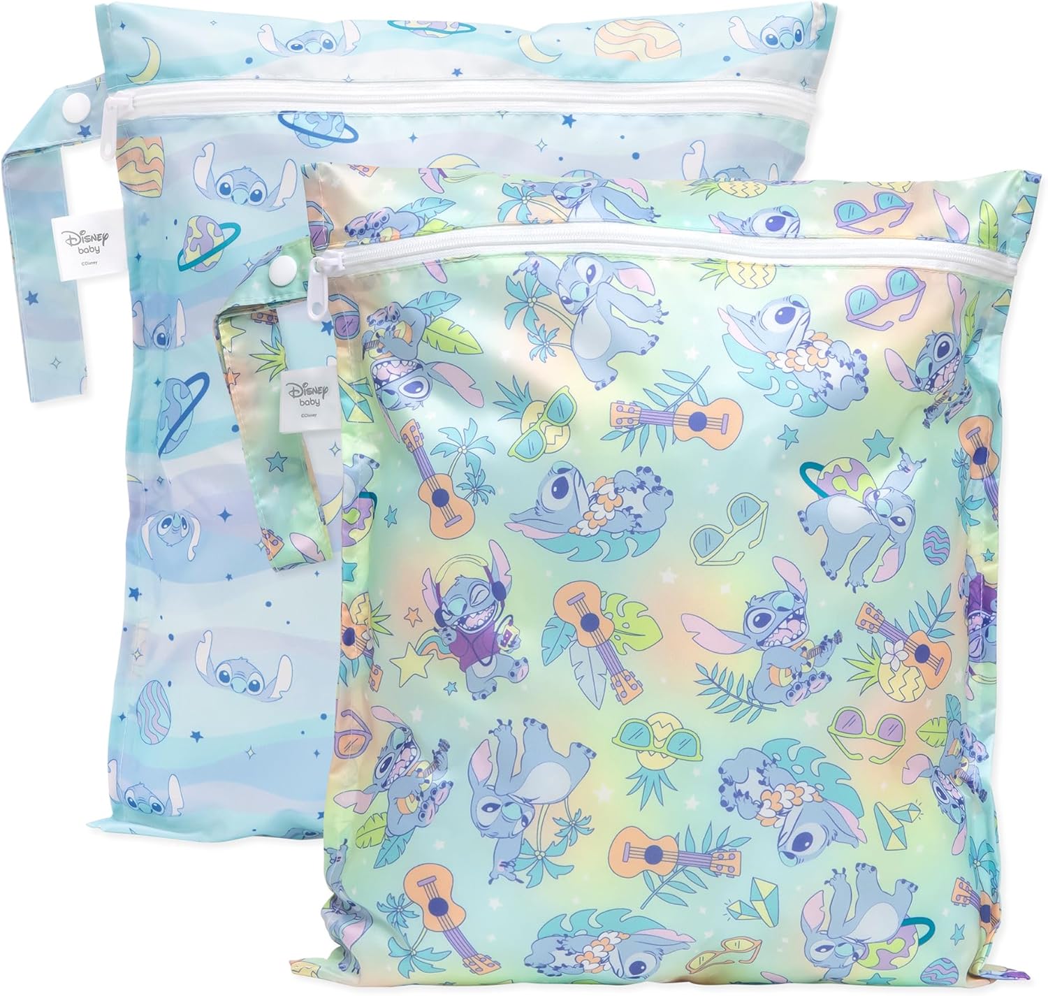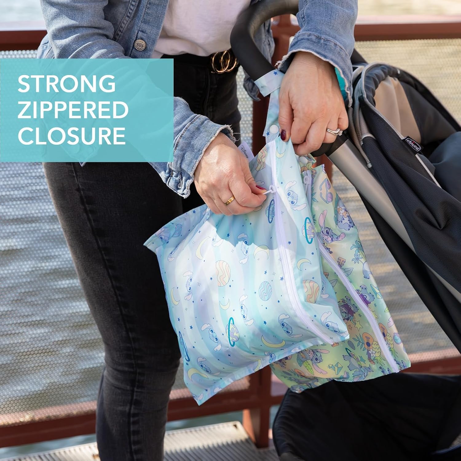 Bumkins - Waterproof Wet Bag - For Baby, Travel, Swim Suit, Cloth Diapers, Pump Parts, Pool, Gym, Toiletry, Strap to Stroller - Reusable & Easy to Clean - 2pk - Disney Stitch