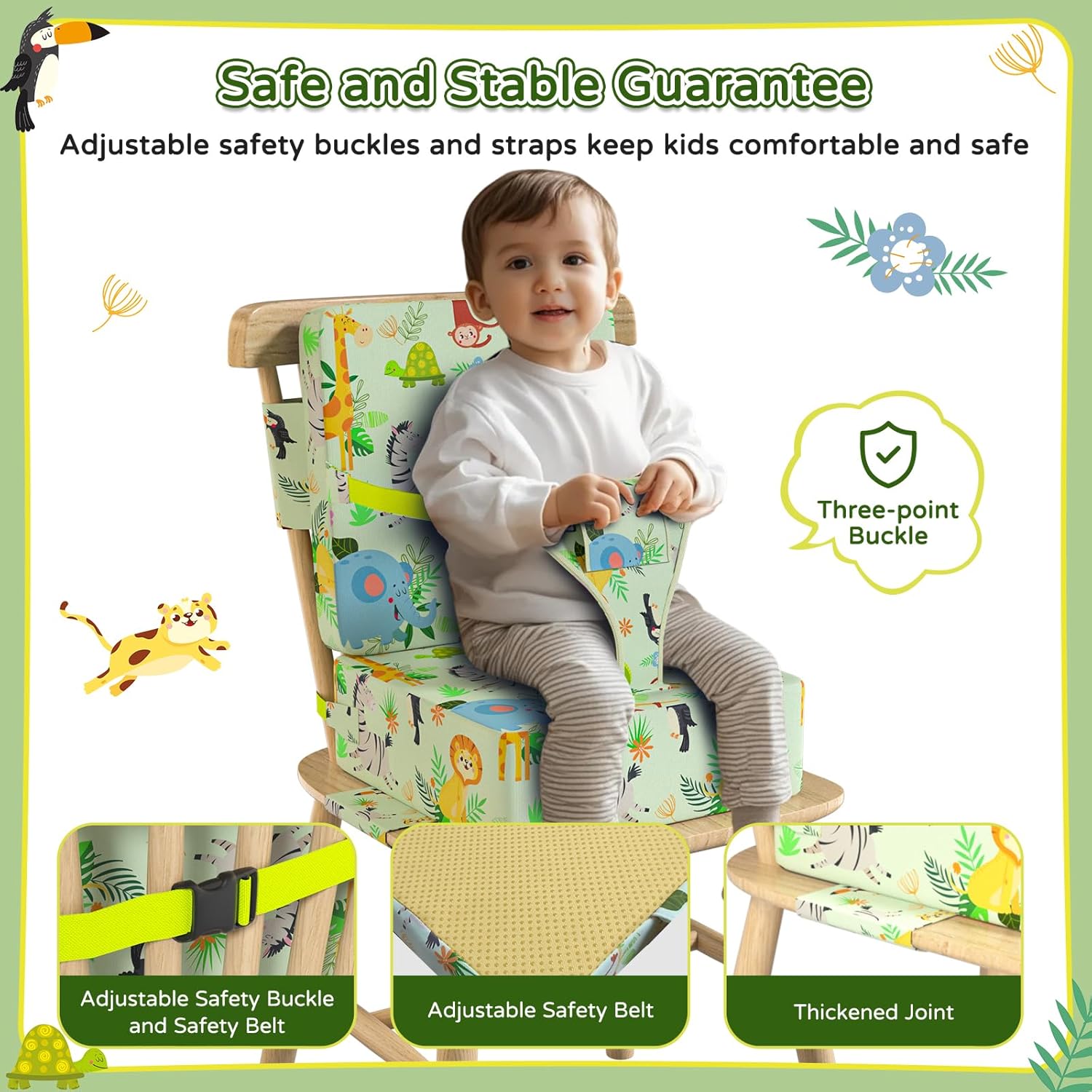 - 【Safe and Stable】: This kids booster seat for dining table is equipped with 4 adjustable safety belts, and the safety belts are extended by 4 inches (10 cm) to firmly fix the booster chair for dining table to the chair from the bottom and back. The bottom of the toddler seat for table is made of non-slip silicone to prevent sliding and ensure the safety of children during meals. Combined with the three-point safety belt protection of the backrest cushion and the front of the toddler booster seat, it provides more comprehensive safety protection for active babies.