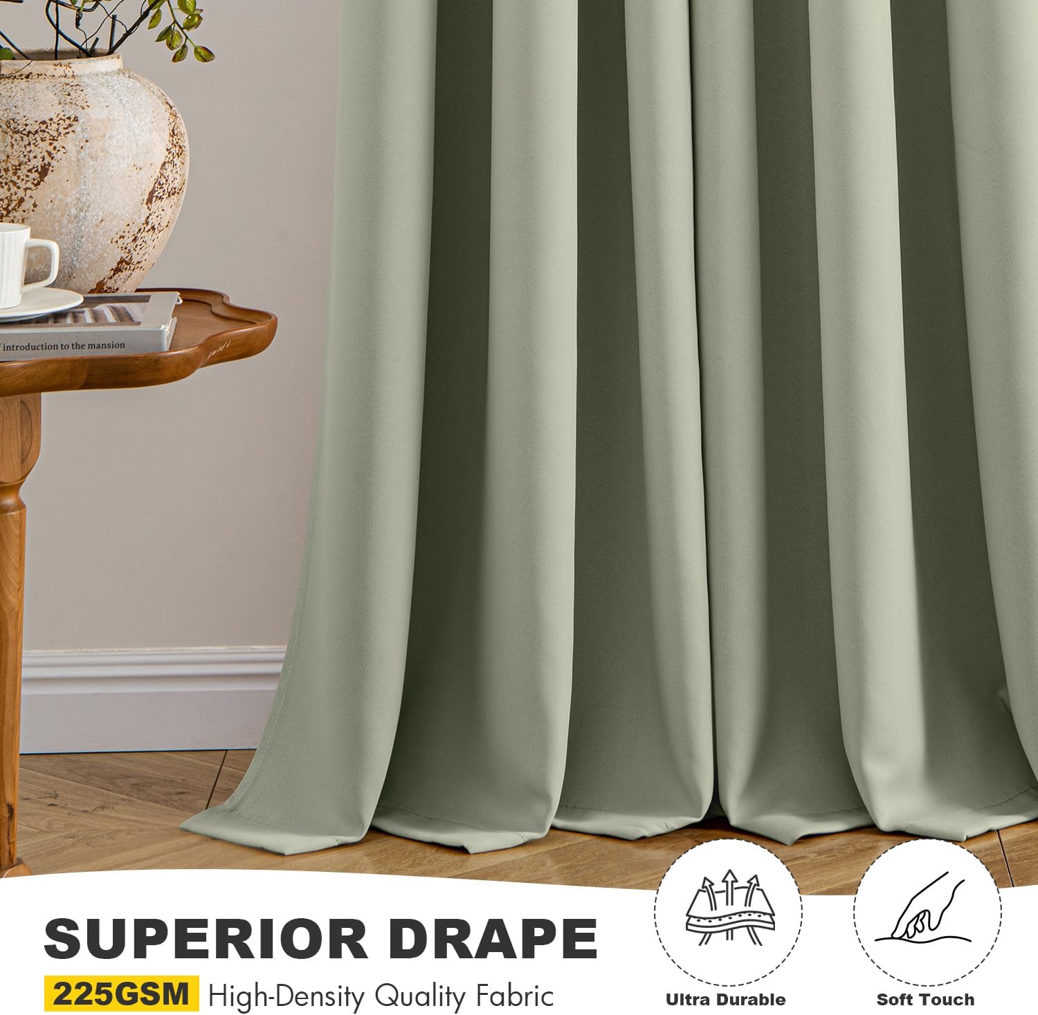- High-Quality Material: Crafted from high-quality 225GSM polyester fabric, these curtains offer enhanced durability and elegant drape. The soft blackout material features triple-layer weaving technology, with a middle layer of black yarn for superior light blocking and privacy. Both sides feature the same refined color, ensuring a seamless look that elevates your homeβs aesthetic with understated sophistication