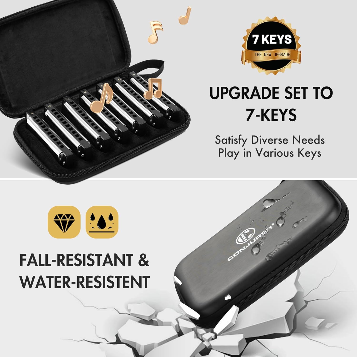 - [Multiple Choices]This newly improved complete 3 or 7-key set is your best option if a single-key harmonica is no longer able to satisfy your playing needs. Products maintain the CONJURER's reputation for being appealing, reasonably priced, and offering after-sale support. Congratulations for moving one step closer to being a musician with this harmonica.