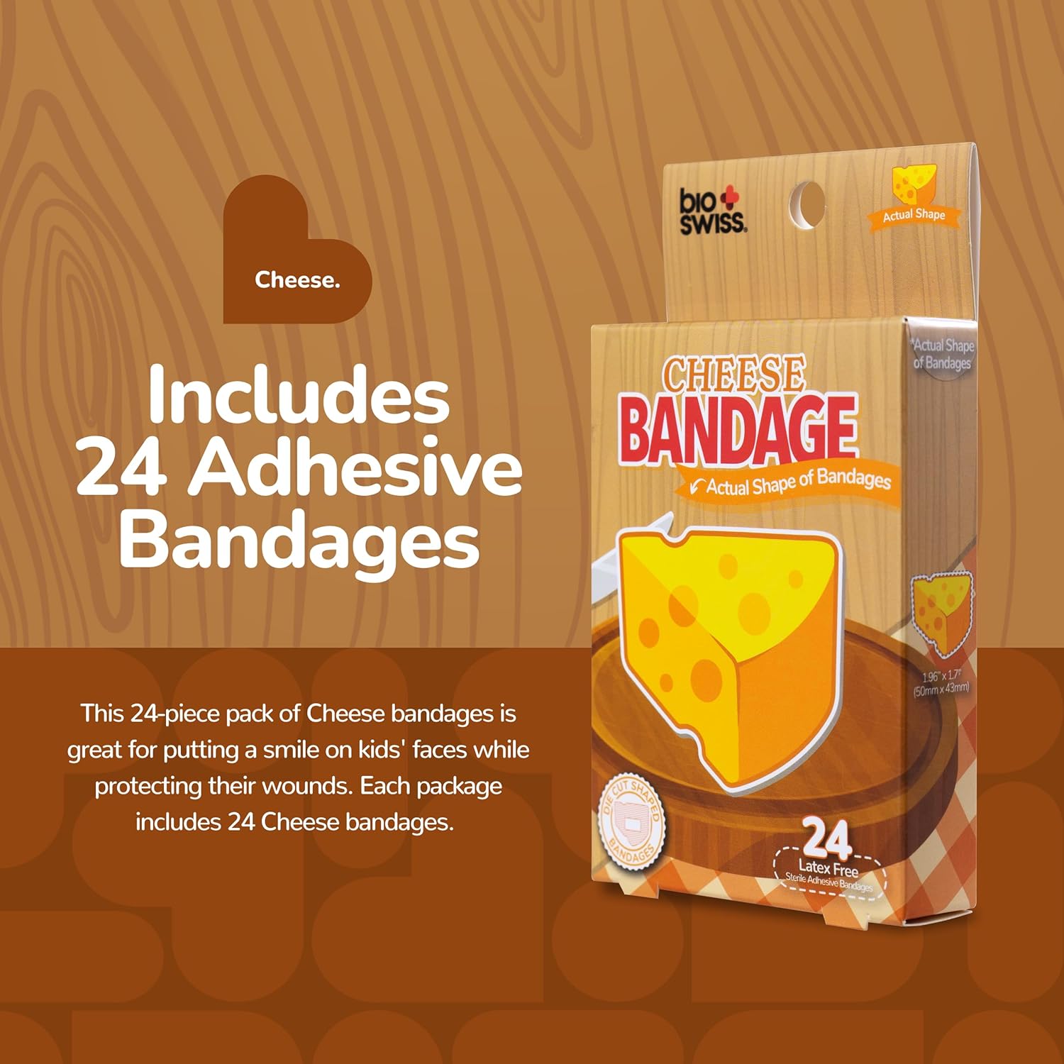 - CHEESE BANDAGES: This 24 piece pack of Cheese shaped bandages is great for putting a smile on kids' faces while protecting wounds such as cuts, scrapes, and burns; sticky bandages come in a cute tin and are perfect for kids and adults alike, and also for school nurses and pediatric doctors