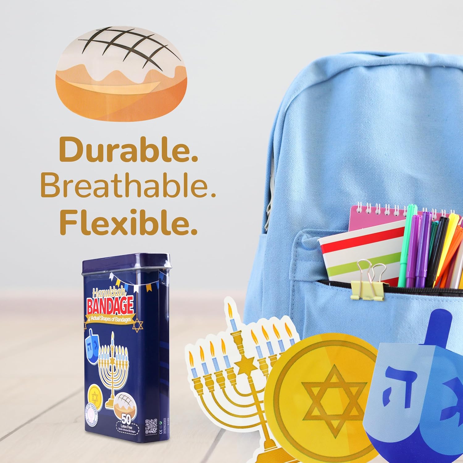 - HANUKKAH BANDAGES: This 50 piece tin of Hanukkah shaped bandages features fun menorah, dreidel, Star of David, and Challah bread shapes, and is great for putting a smile on kids' faces while protecting wounds such as cuts, scrapes, and burns; sticky bandages come in a cute tin and are perfect for kids and adults alike, and also for school nurses and pediatric doctors