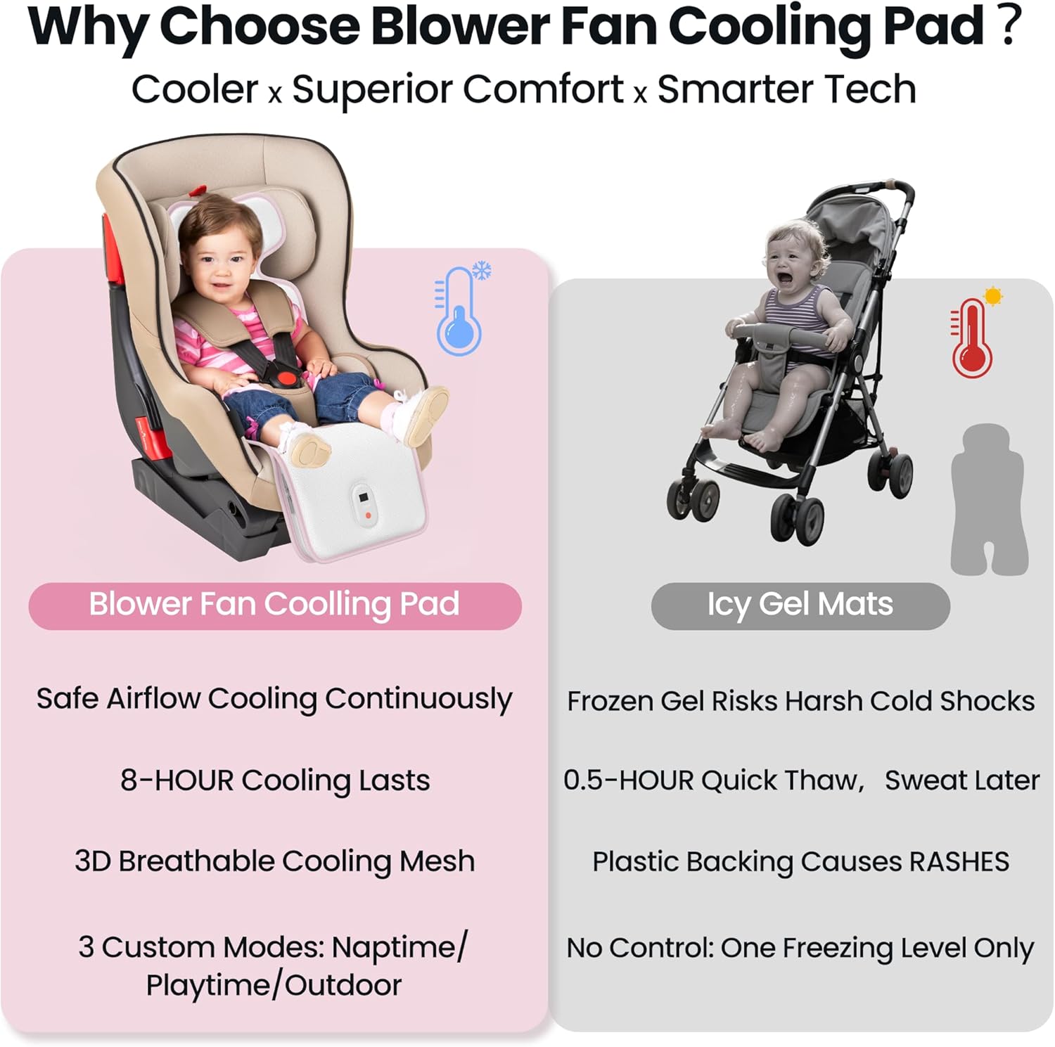 - [Breathable 3D Mesh Fabric+ Continuous Power]Unlike ice gel pads that shock with sudden cold and fade quickly, Our car seat cooler pad for babies uses dual Blower Fans to push active airflow through breathable 3D mesh, gently targeting baby’s high-heat & rash-prone areas.Zero skin irritation, lasting airflow, and sweat-free comfort—keeping your baby happily cool wherever you go.