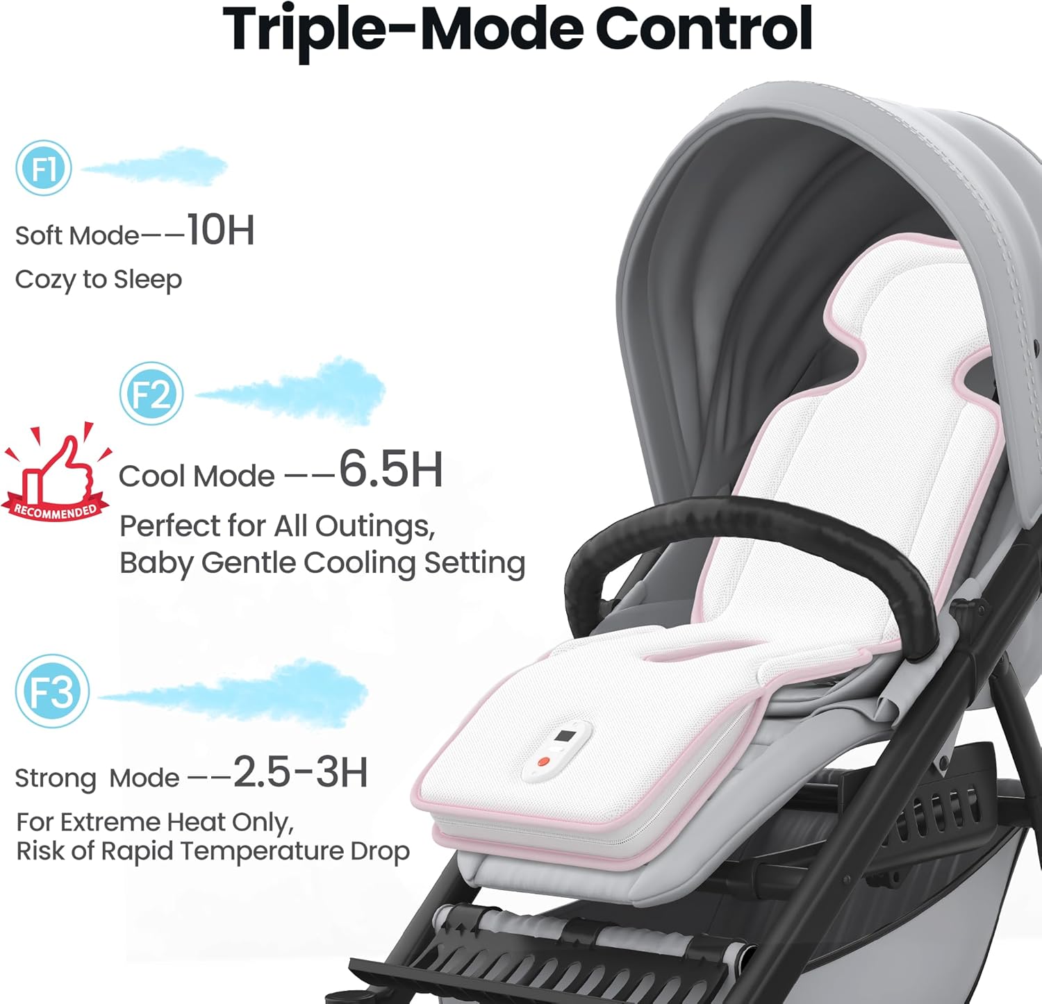 - [3-Mode Control]Car seat cooling pad is powered by a 10000mAh battery, our rechargeable car seat cooler features 3 smart modes: F1/F2 (Recommended): Delivers 6-10 hours of active cooling—ideal for day trips to parks or theme parks. Adjust wind strength based on heat intensity. F3 (Situational): Instant airflow-cool relief for extreme heat(When baby sweats a lot).