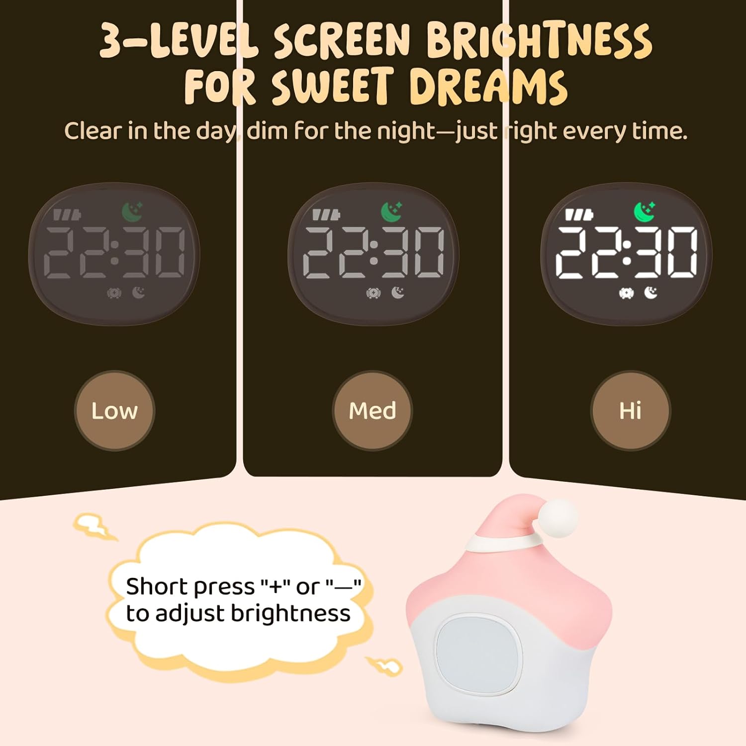 - Multi-Mode Night Light – Tap the kids alarm clock body to cycle through two brightness levels, a gradual transition mode, and a fun seven-color option. Eye-safe LED lighting creates a cozy bedtime environment while doubling as playful ambiance lighting.