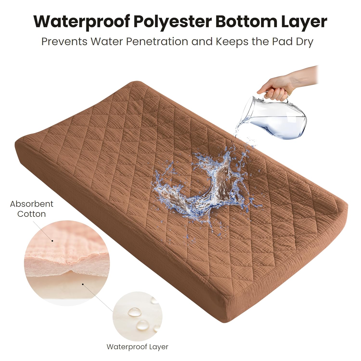 - Quilted and Soft Fabric: Our changing pad cover consists of three layers: the top layer is made of 100% cotton (muslin), which is soft and absorbent; the middle layer is quilted with soft padding to ensure coziness and comfort; and the bottom layer is made of 100% waterproof polyester to protect the pad from wetting. Our unique design provides a comfortable touch for your baby while ensuring waterproof functionality, making our changing pad soft and perfect for delicate baby skin.