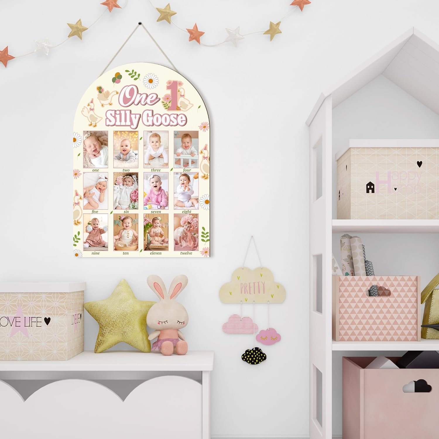 R HORSE My First Year Photo Frame Board, 3D One Silly Goose Birthday Decorations Display Wood Board, Baby First Year Picture Frame 12 Months Milestone 1st Birthday Nursery Decor Gift for Boy Girl