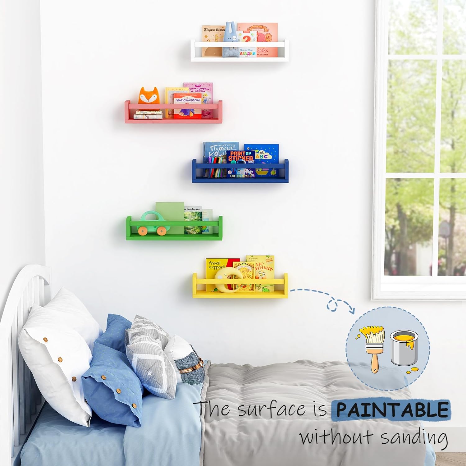 - [Perfect for Nursery and Kids Room] Without taking up any floor space, hanging those floating nursery bookshelf on your nursery wall or kids room wall, Kids can easily place picture books, stuffed animals and toys in wall shelving, where they'll be off the floor and easy to reach by themselves.