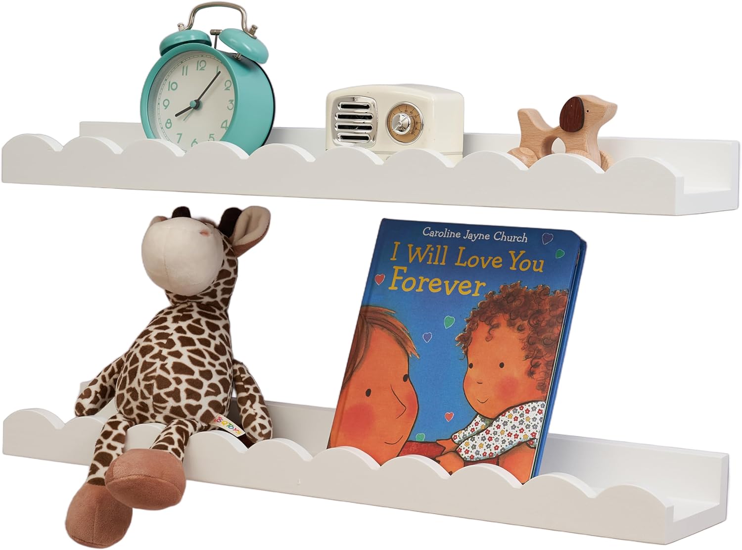 - ăStylish Scalloped Designă This scalloped floating shelves has a scalloped rounded front with smooth rounded corners and a minimalist design that is child friendly to use while adding a touch of sophistication to any room. Perfect for organizing bookshelf, toys and school materials, this nursery book shelves can also be used as children's room dĂ©cor to add a cute and fun element to their room