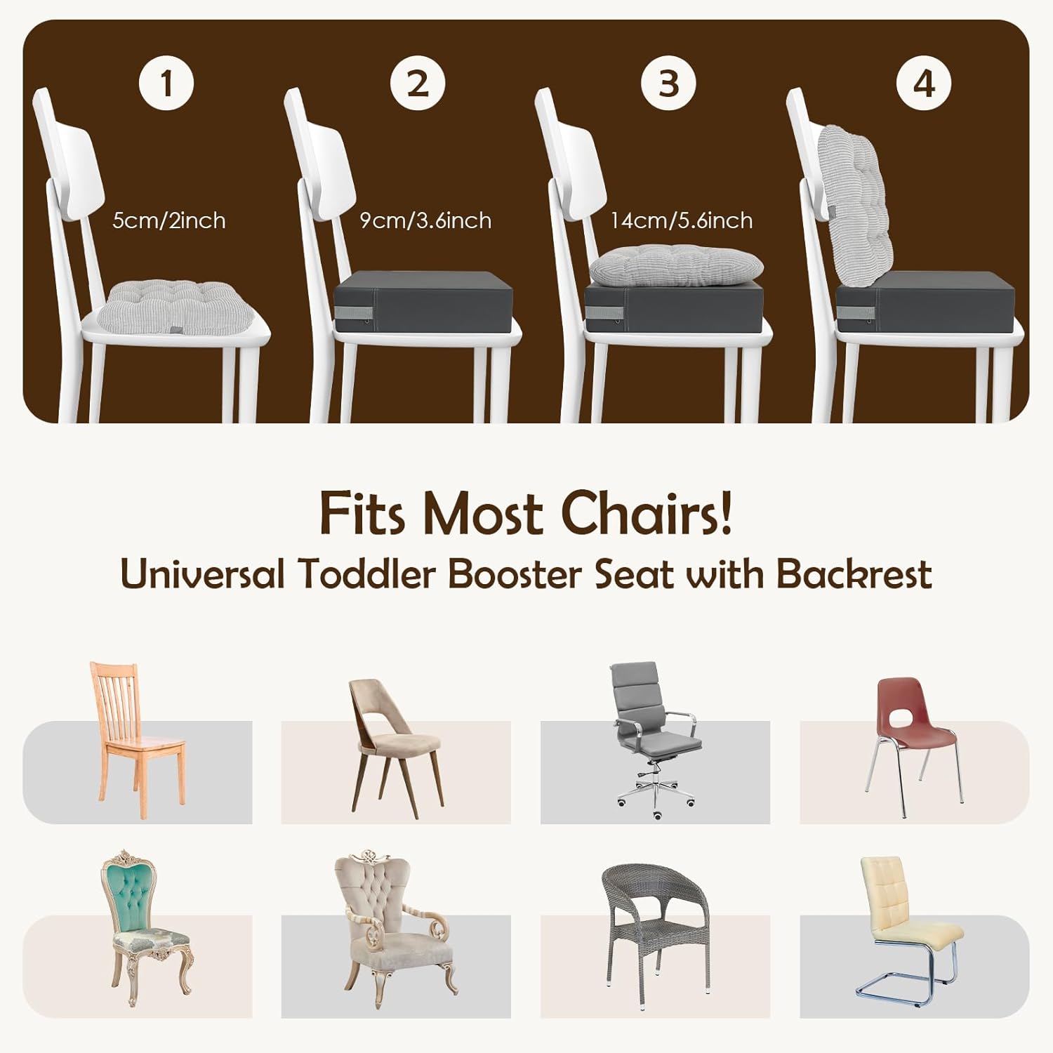 - 🪑【Upgrade 2-in-1 Toddler Booster Seat for Kitchen Chair & Dining Table】:This toddler booster seat includes a seat cushion + backrest set designed for most kitchen chairs and dining room chairs. Compared to other single booster seats, our kitchen chair booster seat adds a Separable backrest cushion, helping them maintain proper sitting posture.Whether it's breakfast, lunch, or dinner time, this dining chair booster seat toddler offers the ideal elevation and support for children aged 2-12 years.