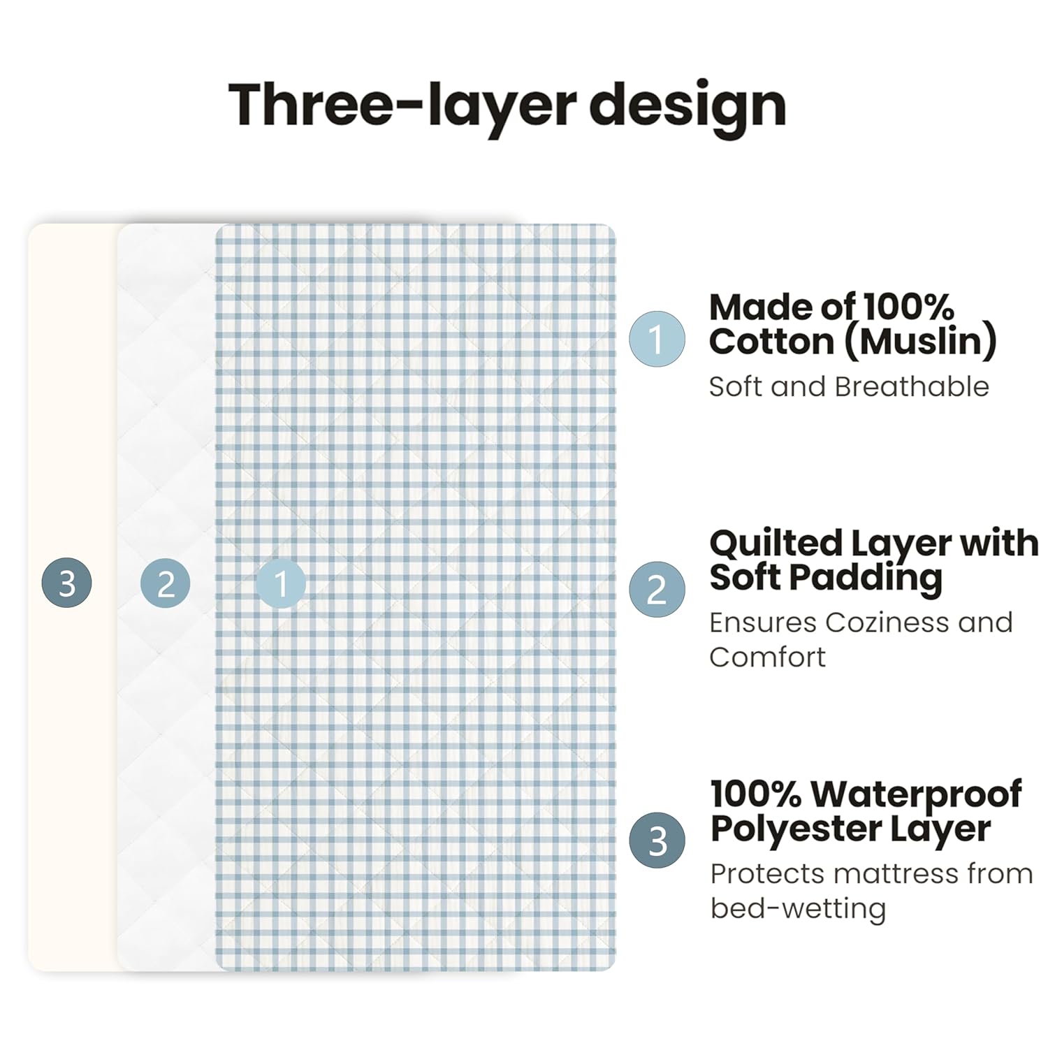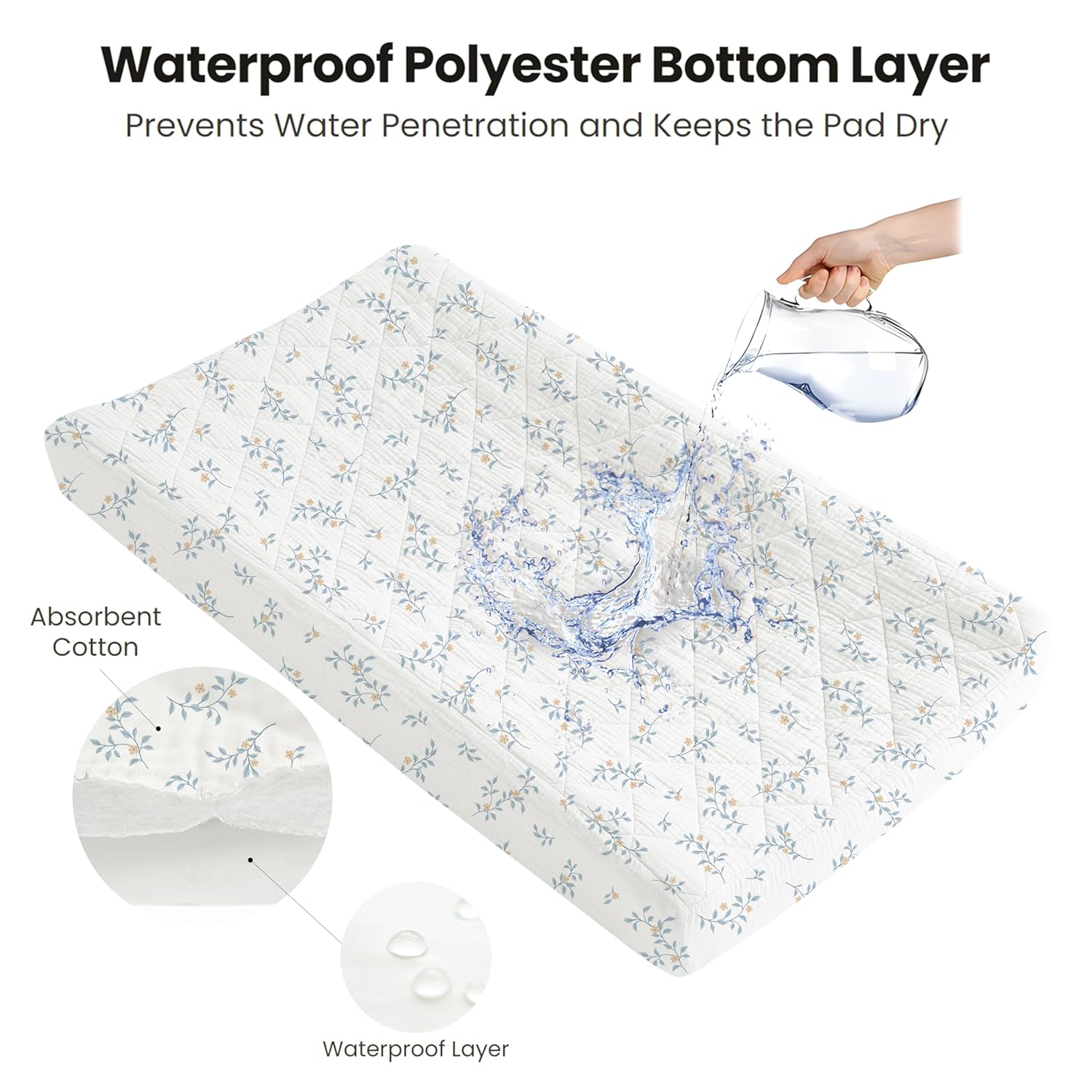 - Quilted and Soft Fabric: Our changing pad cover consists of three layers: the top layer is made of 100% cotton (muslin), which is soft and absorbent; the middle layer is quilted with soft padding to ensure coziness and comfort; and the bottom layer is made of 100% waterproof polyester to protect the pad from wetting. Our unique design provides a comfortable touch for your baby while ensuring waterproof functionality, making our changing pad soft and perfect for delicate baby skin.