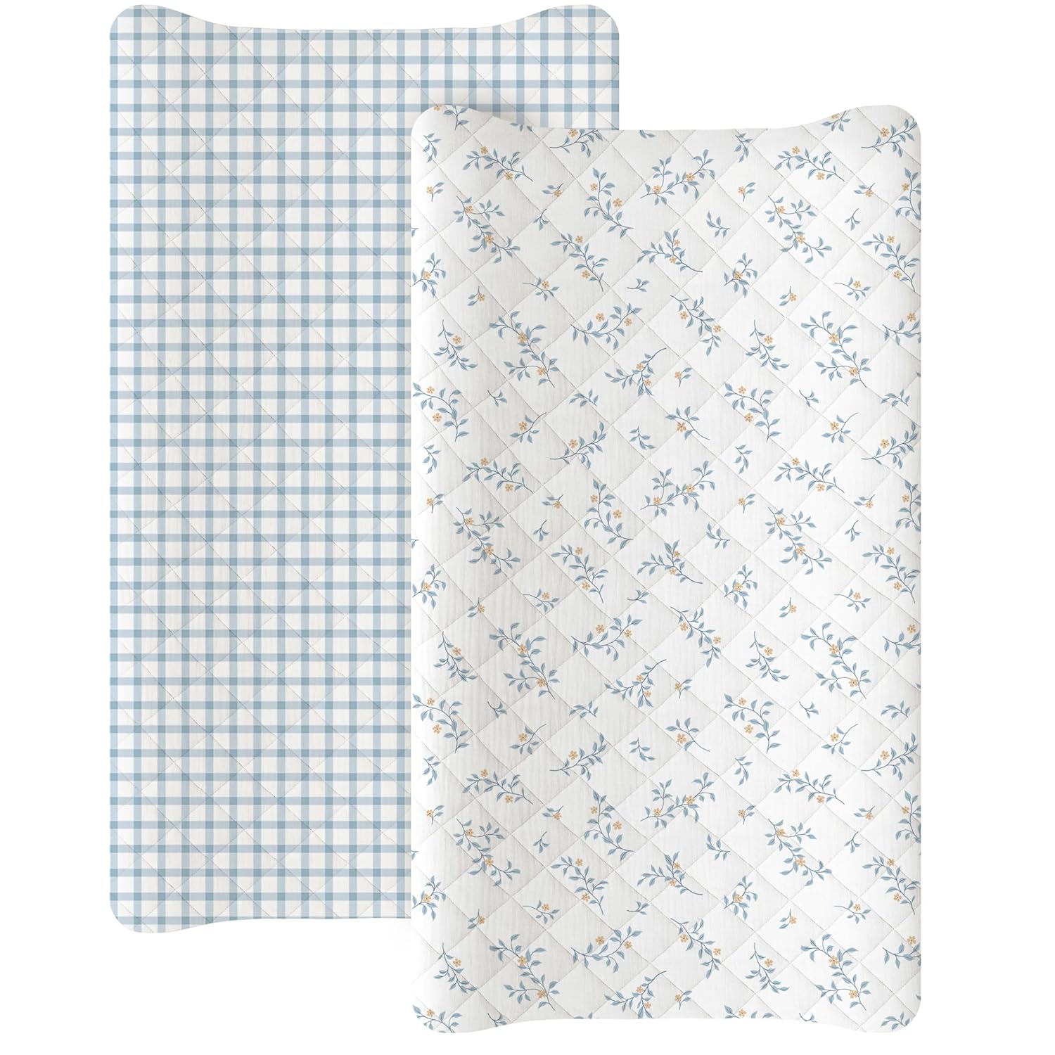 Konssy Waterproof Muslin Changing Pad Cover 2 Pack, Quilted Cotton Fitted Diaper Changing Table Cover, Soft Changing Pad Sheets for Girls Boys (Blue Gingham Blossom)