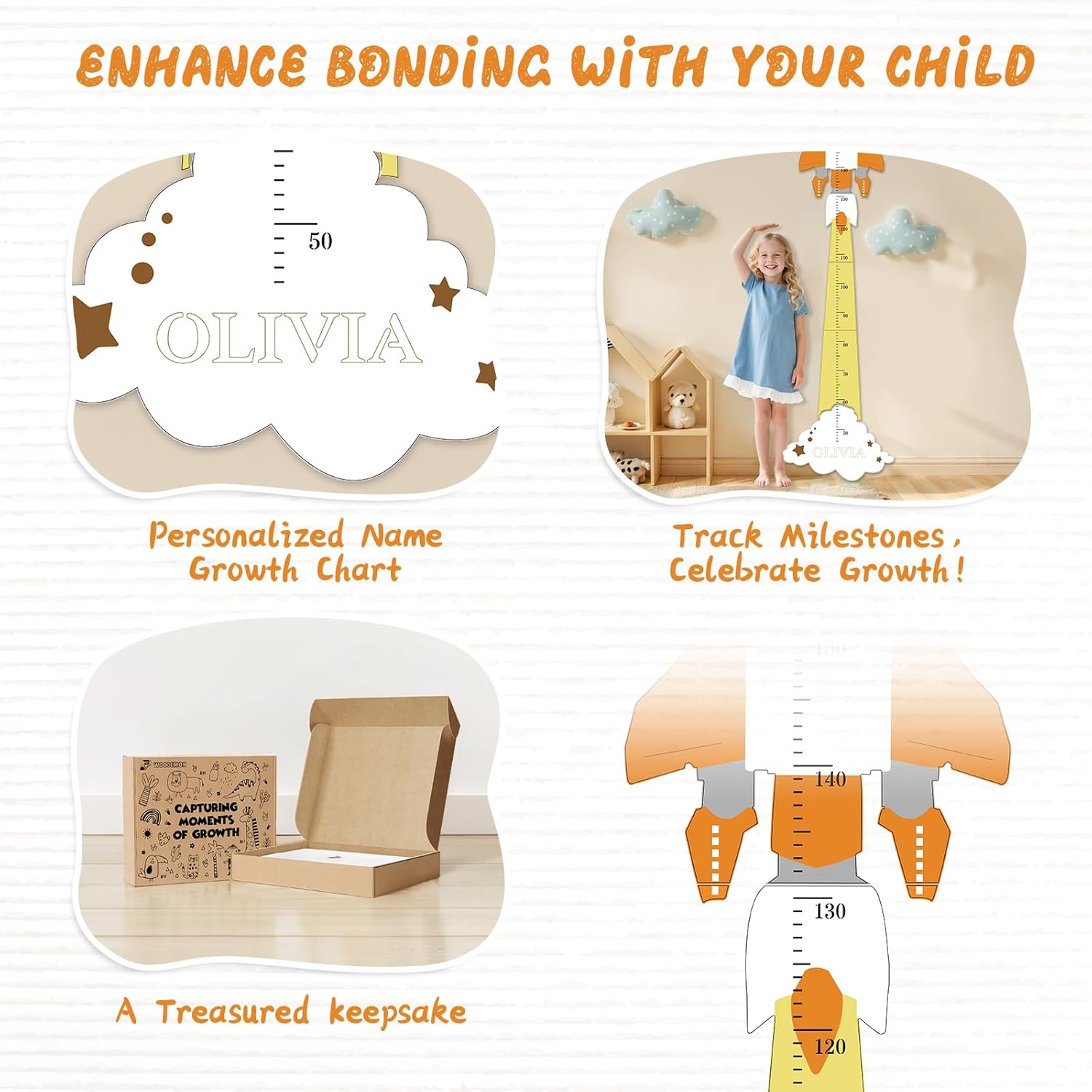 - Personalized Name Growth Chart: The height ruler wall tape can customize the name, measurement scale (centimeters or inches) for a personal touch, attracting the baby's attention. Kids height wall chart creates precious childhood memories, making measuring height interesting and not boring.